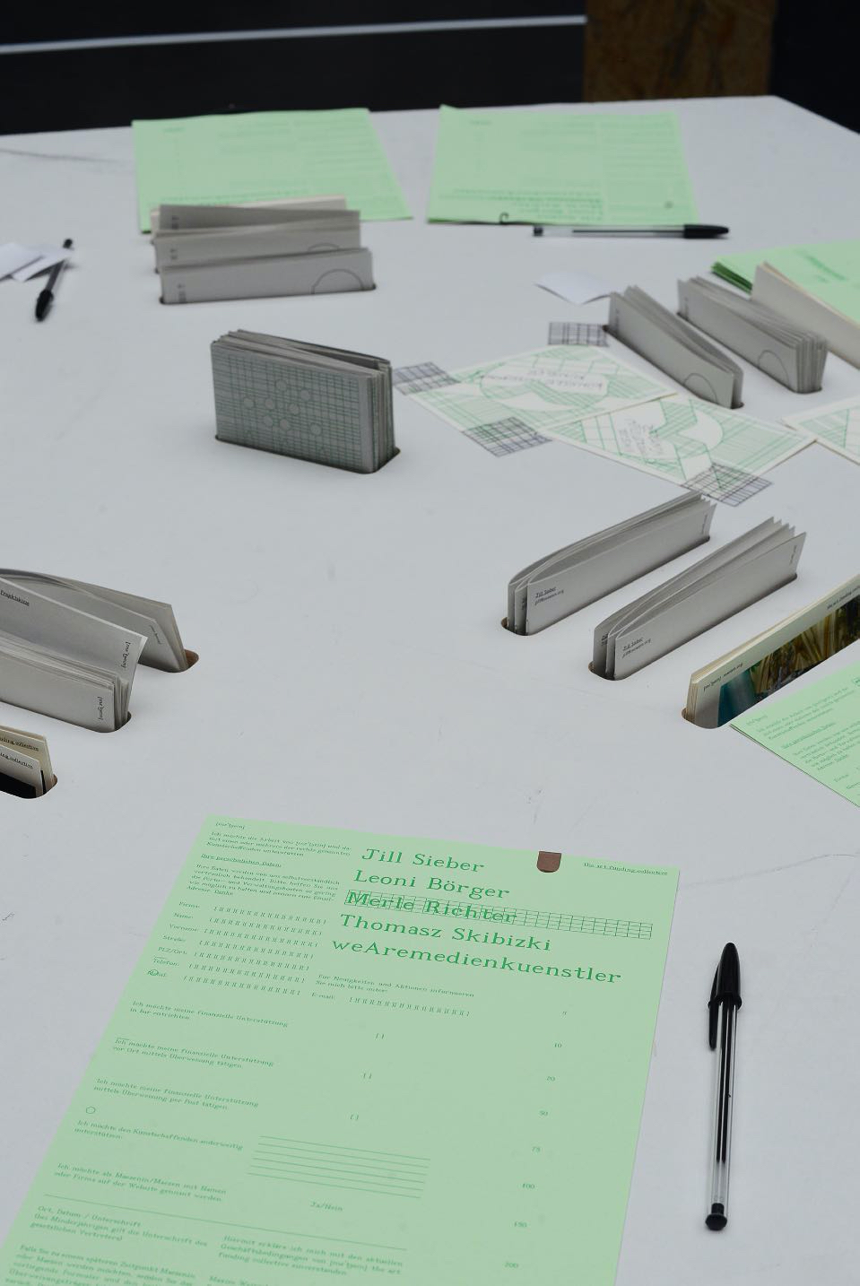 Following the research, a new method of art funding was conceptualized that acknowledges the demands of artists and art supporters. Deriving from an older name for art patrons, it was called [maetsen] the art funding collective. During the annual summer exhibition, the new platform was opened and presented in the format of a fair stand.Visitors were invited and asked to donate an arbitrary amount of money to support the project ideas of the artists.